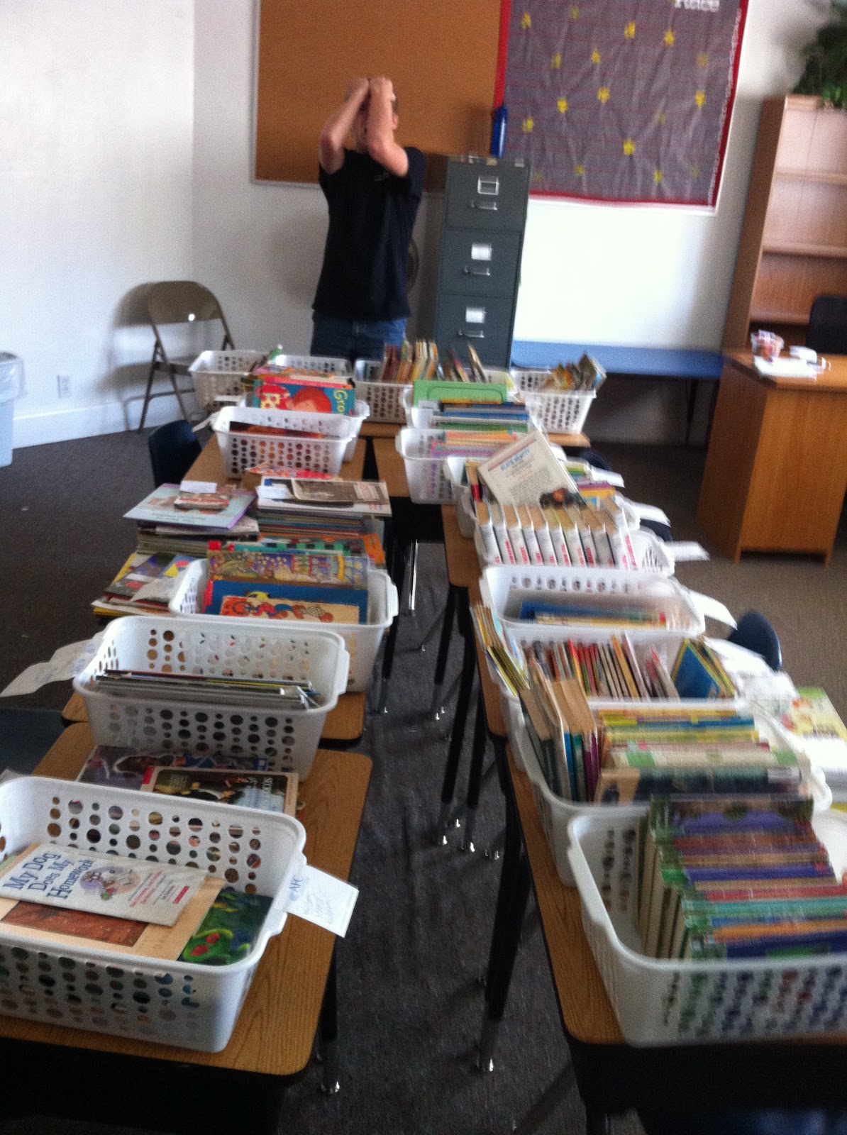 The first thing I did before I moved was to pull all my books off traditional shelves, buy a ton of baskets from the $1 store and sort my library. I had no idea how many books I had collected in just a short while. As you can see, my overwhelmed fifteen year old son helped me sort. I think we estimated around 700 books. I've been back to the $1 store 3 times for more baskets!